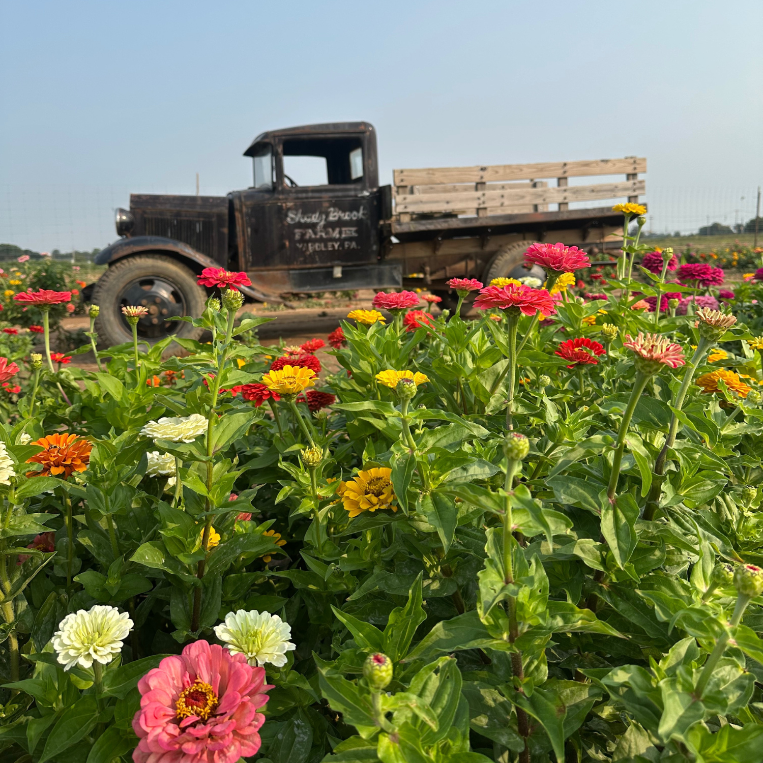 - A rainbow of colorful zinnias in peak bloom